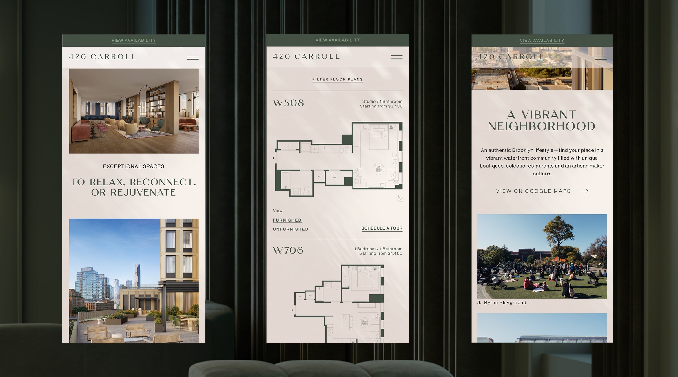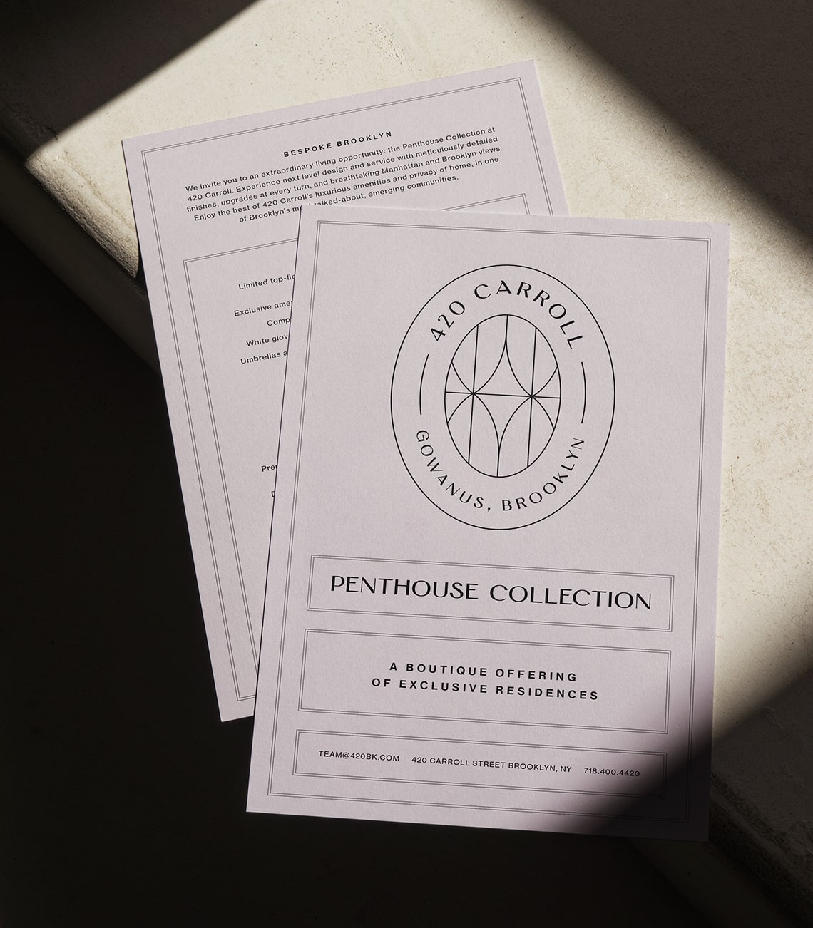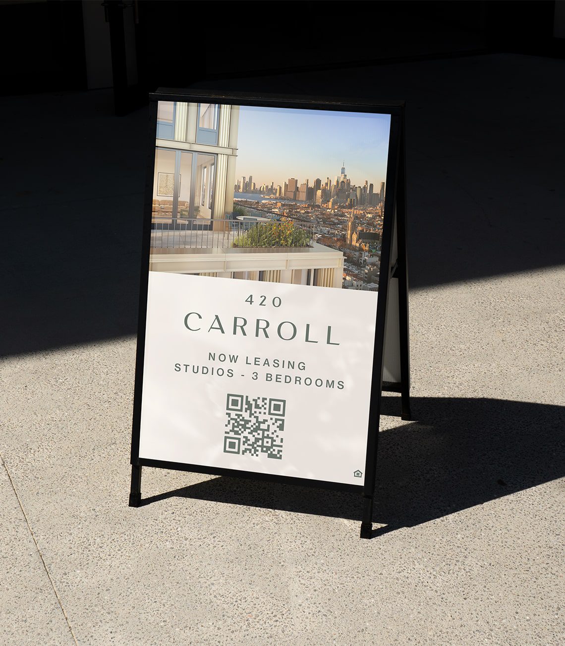 Square Feet built a brand that mirrors the building’s ethereal qualities and waterside setting. Drawing on the rippling movement of water and the calm of a sophisticated retreat, the campaign captured a sense of craft, artistry, and modern design. The tagline, Bespoke Brooklyn, positions 420 Carroll as a place artfully made for those who thrive on the creative energy of Gowanus—whether artists themselves or residents seeking an inspired lifestyle in one of Brooklyn’s most dynamic neighborhoods.